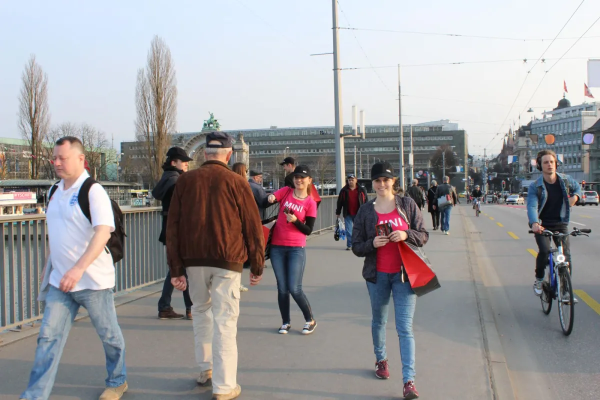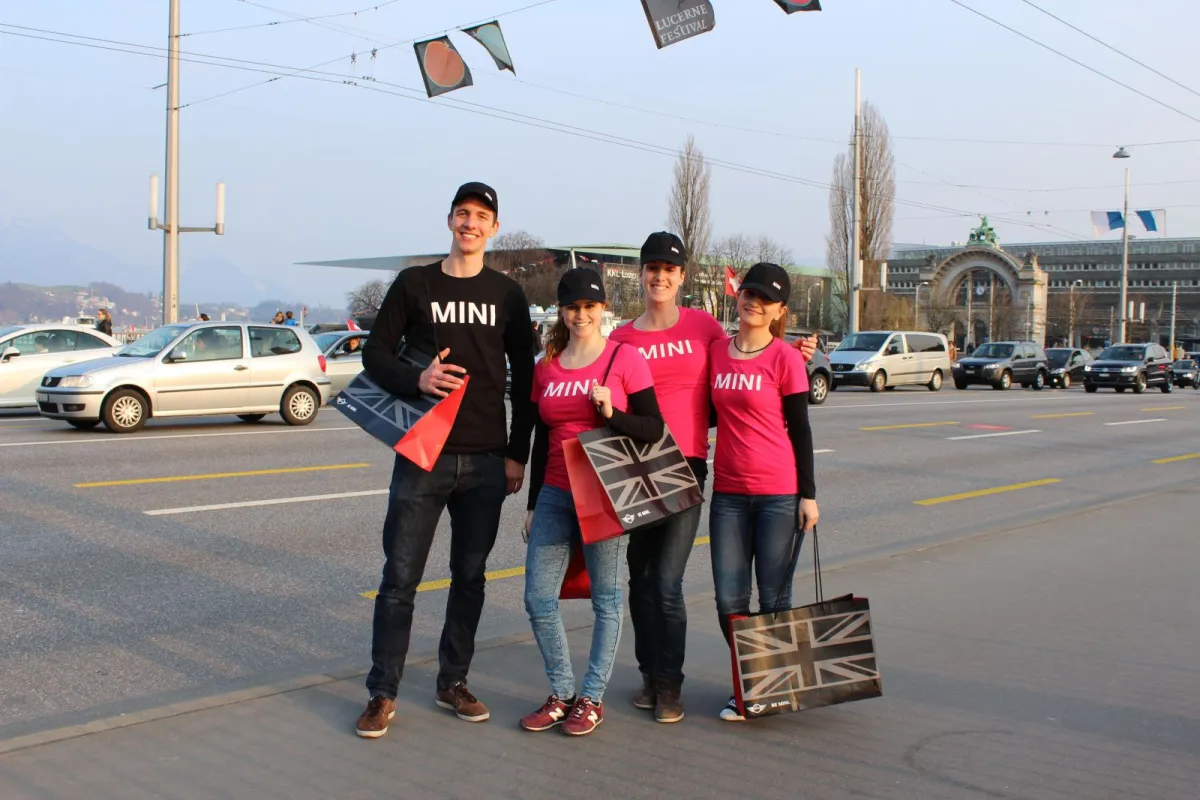 Ausgestattet mit 8 farbigen MINI’s besuchen unsere 16 PromoterInnen (8 Fahrer & 8 Hostessen) diverse Standorte in der Stadt Luzern und beglücken die Passanten mit der Abgabe eines Give-aways. Durch den MINI – Konvoi von 8 farbigen MINI’s erhöht sich die Aufmerksamkeit dieser Promotion und stärkt den Markenauftritt zusätzlich.