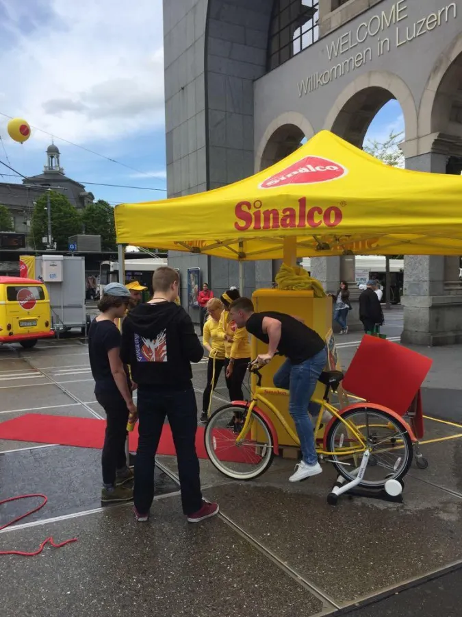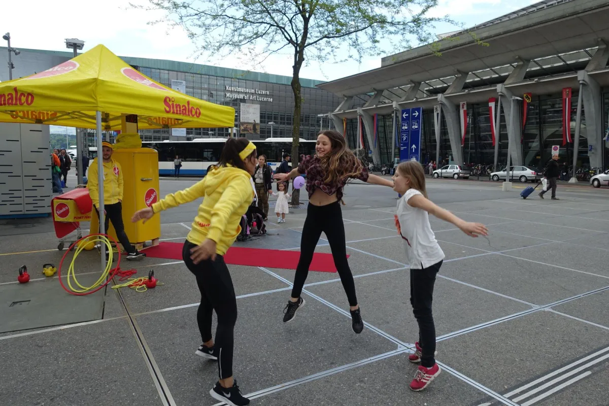 Somit heisst es für unsere SINALCO Promoterinnen, sich aktiv zu bewegen und die Pendlern zu schweisstreibenden Aktivitäten zu animieren. Rad schlagen, Hanteln stemmen, Beachcruiser fahren. Hauptsache man dreht auf.