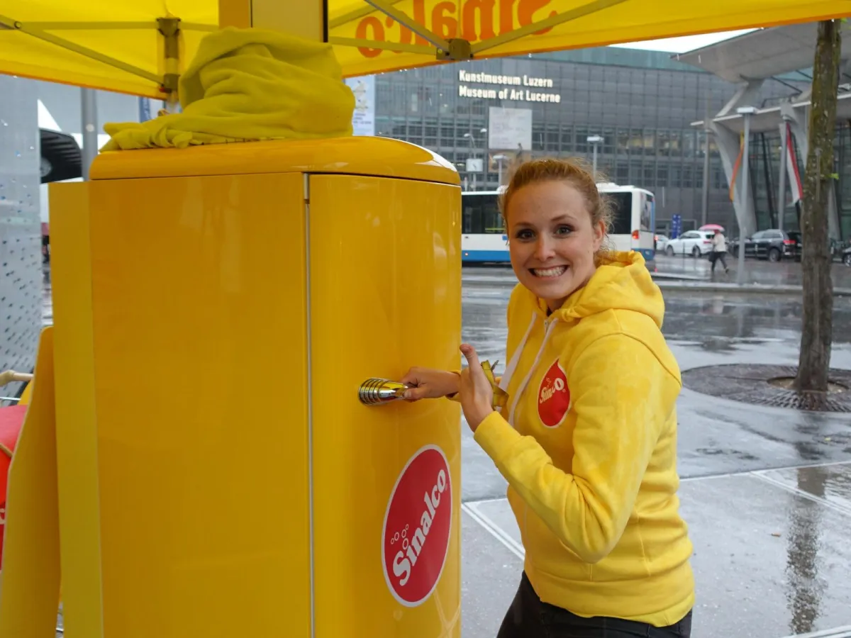 Im Zentrum der Dreh - auf - Kampagne befindet sich ein riesiger SINALCO Kühlschrank. Dieser lässt sich dank eines Sensors im Griff nur dann öffnen, wenn der Puls mindestens 140 beträgt.
